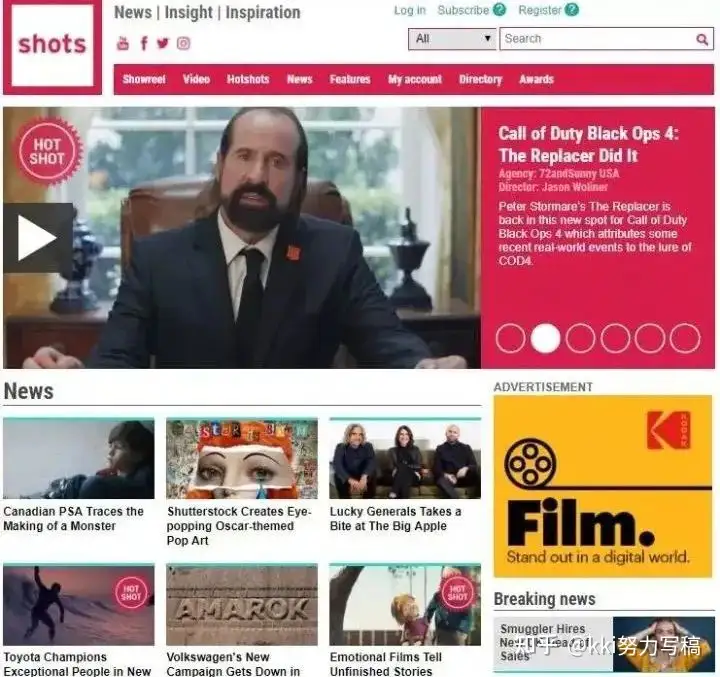 02 Shotshttp://www.shots.netShots是推荐亚洲地区最知名的电视节目广告电影集,以汇聚展现亚洲地区世界顶级电视节目Attichy为核心理念每星期Shots都保有超过42000位电视节目Attichy及电视节目制做应用领域的中文质量中文专精听众,被认为是以获取这个行业前沿资料库的原动力。