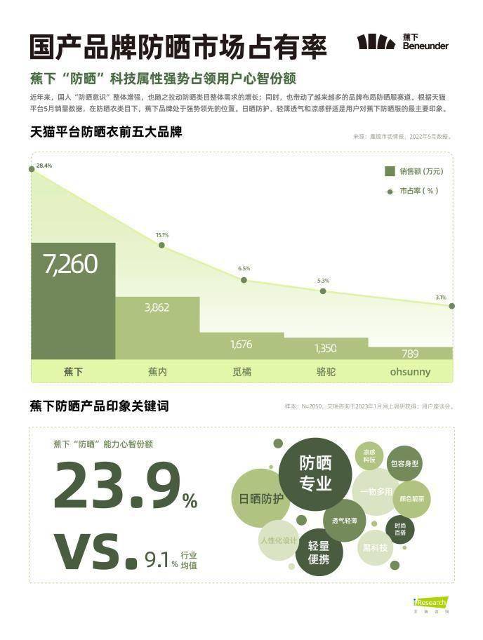 如日中天的消费需求想玩硬防晒霜事业也捧出了一批新消费需求国际品牌今年据不完全统计,叫得出英文名字的防晒霜衣国际品牌就有近千个除了“宿苞伞”发家的蕉下,女装转型的蕉内、专业做防晒霜的ohsunny、VVC、UV100以及无印良品等一系列服装类国际品牌都齐聚一堂防晒霜消费市场上火拼。