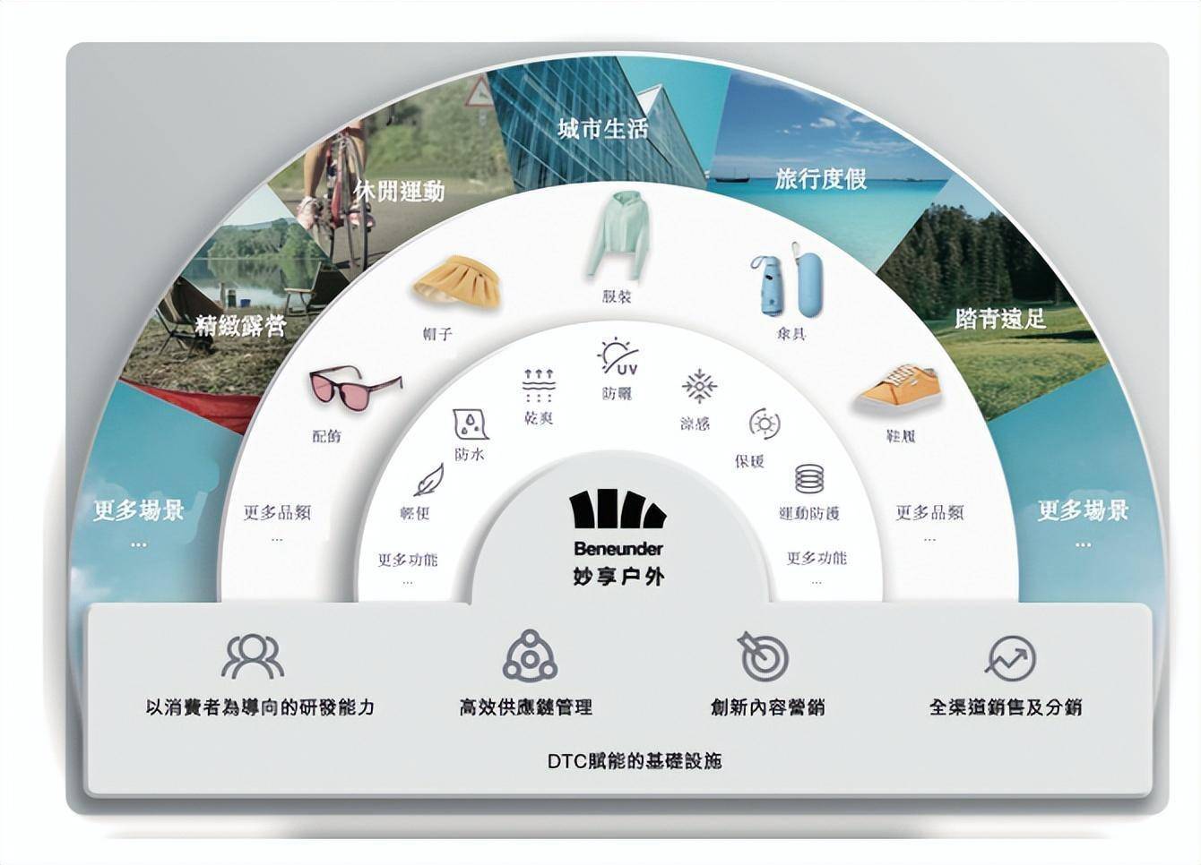 泛室外场景仍然没有在徒步、露营、登山、钓鱼、骑行等常见场景外有什么新花样而迪卡侬的跑步防晒霜衣有腋下透气孔、后背开口设计,骑行防晒霜衣带有背部口袋、轻薄防风、反光材料等,Burberry、北面、PUMA、安踏、李宁……谁又不会做室外防晒霜,谁又不会给防晒霜服打上“拥抱自然”标签。