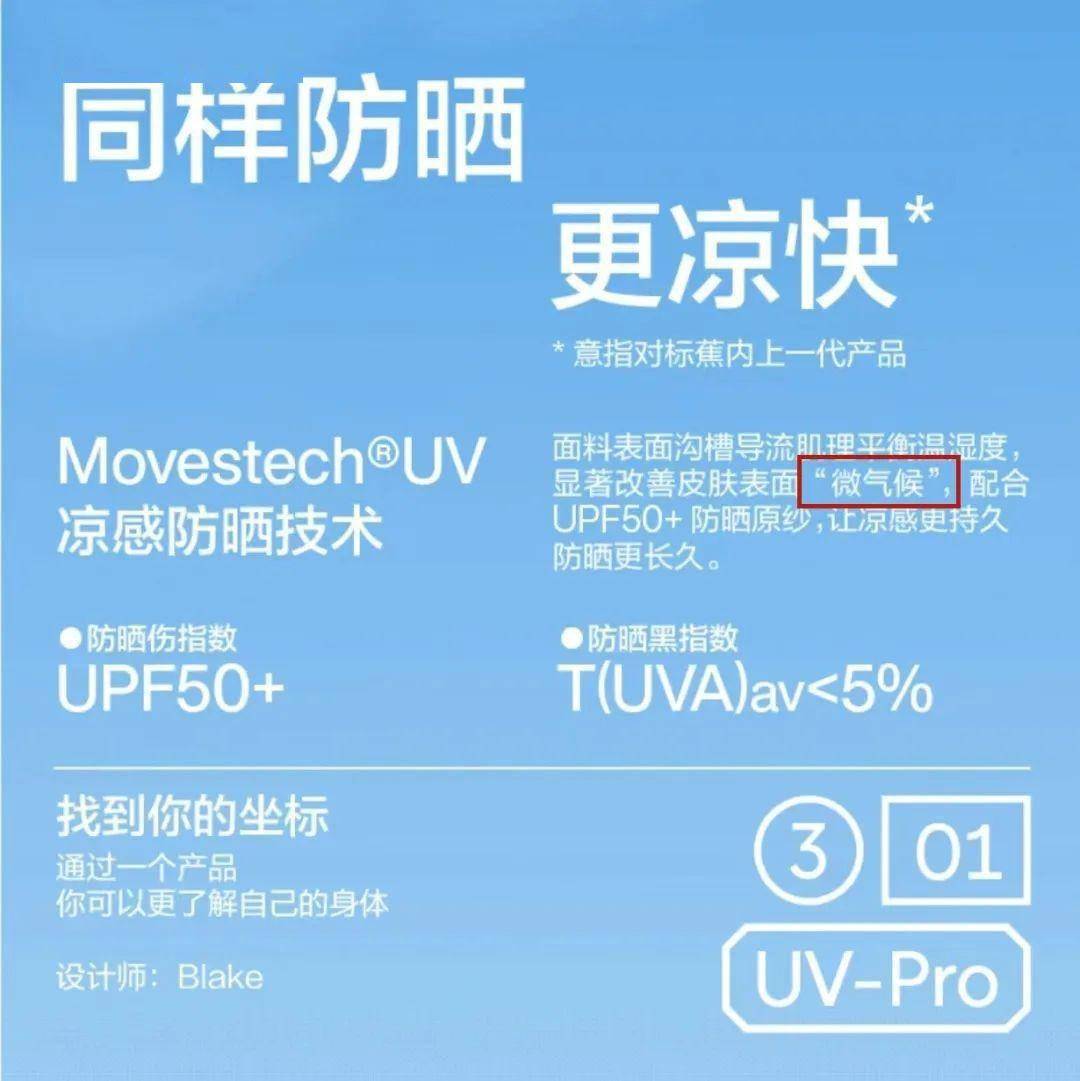 而让人和蕉下分不清楚的蕉内同样将防晒霜伤指数(UPF50+)和防晒霜黑指数(T(UVA)av<5%)标在商品详情页上,他这里的“Movestech UV凉感防晒霜技术”又是一个新名词。