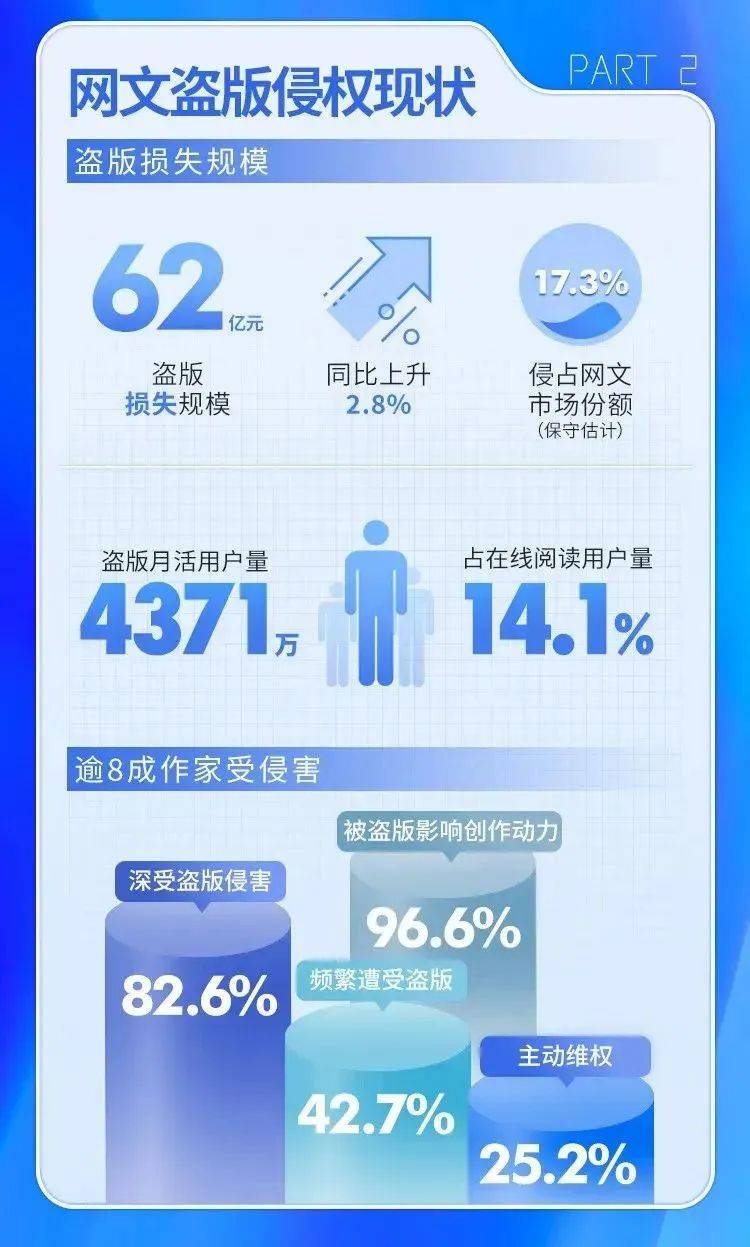 在国内,超过8成的网文作者都遭遇过经典之作作品被盗版应用软件根据中国版权协会,在 2021 年,中国网文盗版应用软件损失体量为 62 亿元,盗版应用软件平台整体月度活跃使用者量为 4371 万,占在线阅读使用者量的 14.1%