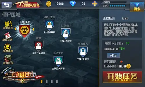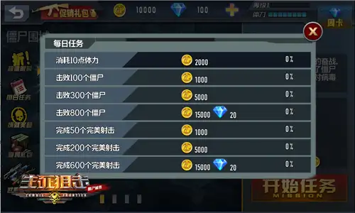 稳健的每日任务获得收益每日任务可谓《生死狙击之僵尸前线》中最稳定的收益获取途径了,每天只需按照固定任务说明完成相关的任务数据,即可获得客观的收益,同时可获得少量钻石加上每日任务中所需挑战的僵尸难度较低,基本上不会出现特种级僵尸,因此,只需精确瞄准僵尸的头部弱点,触发完美射击,即可完成任务获得金币。