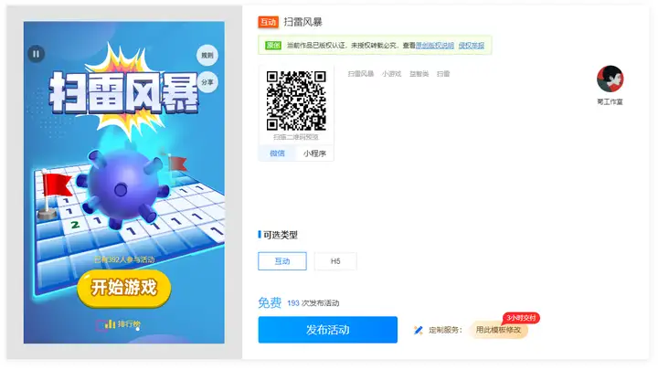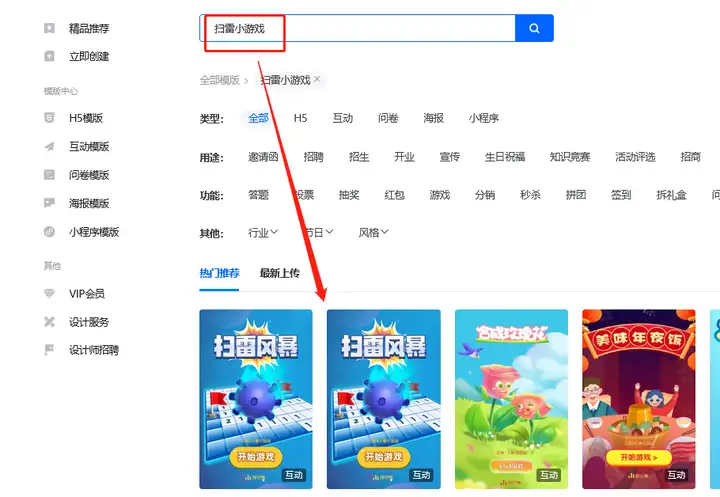 他们打开制作工具的官网,然后点击免费模版,这样就能跳转到搜索页面,直接输入【扫雷迷你格斗游戏】开始搜索,这样就能找到啦~