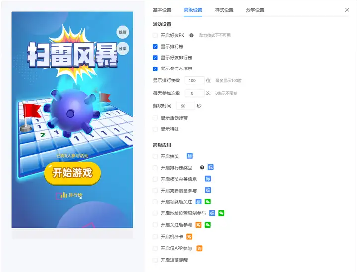 高级增设:包含开启好友PK、显示排行榜、显示好友排行榜、显示参予人数、参予次数、显示弹幕、显示特效等等。