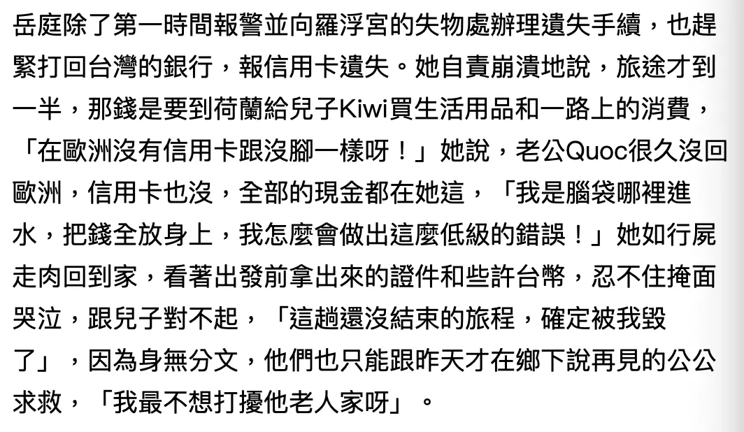 岳庭辨认出失窃后,当即大哭了起来,即使她们一家人所有的旅途钱款,还有给女儿读书买的日用品的费用都在里头,更重要的是由于一家人仅有的三张网银也在她的手提包里,如今通通被“消亡”,令她觉得就是举步维艰以她的话来说就是在西欧没有网银就像没有脚一样,几乎举步维艰,也想必她会崩盘大哭。