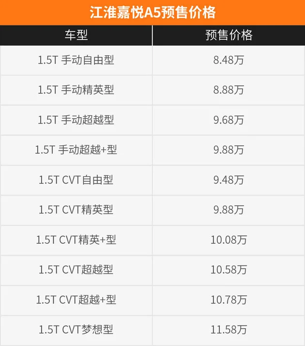 2、江淮嘉悦A5已经开启预售,新车共推出10款车型,预售价格区间为8.48-11.58万,官方宣称新车将与广州车展正式上市此外,预售期间下订的用户可享受6000元现金优惠,同时享受6000元置换补贴、3年0利息金融政策。
