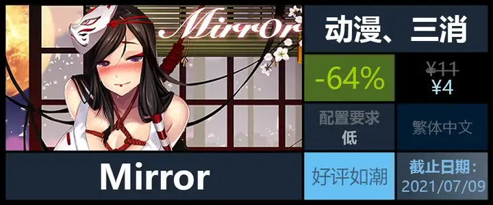 动作游戏是将给出的色块按照渐变色的顺序排列就可以通关,挺新颖的,色弱玩者别玩了,间接劝退缺点就是格斗游戏时长比较短,虽然动作游戏新颖但一直是这样会无聊,人物互动也比较少就点两下而已,但作为小黄油,光凭这款格斗游戏的立绘就可以让LSP们纷纷掏钱了。