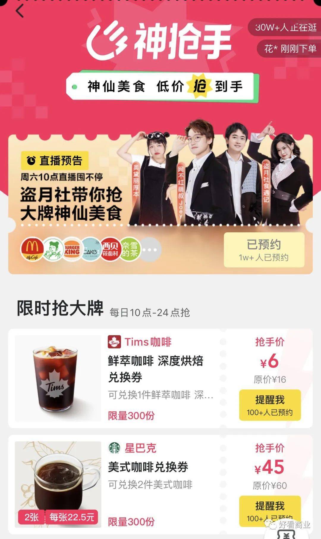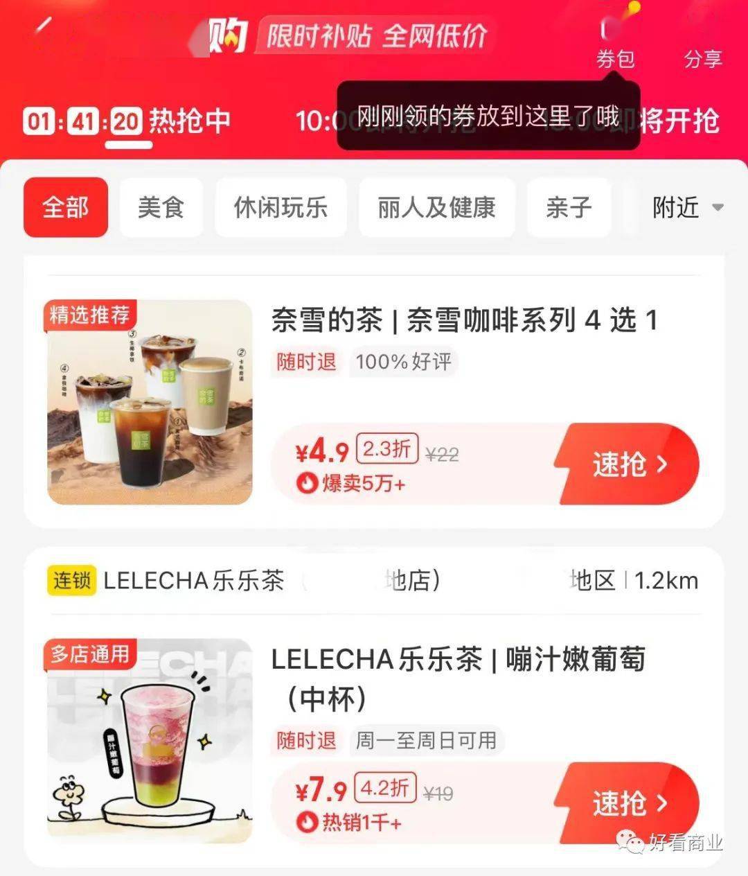 这次试水后,直播将成为携程送餐“神券节”的固定动作,每月18日直播3月下旬,携程APP在美食页面新增了“特价团购”板块,打出的口号是“限时补贴,全网低价”在这个板块可以看看到,诸如奈雪的茶、蜜雪冰城、麦当劳等连锁品牌提供的特价团购产品,每款产品都会为在售价侧方标注能省多少钱,或者提供的折扣。