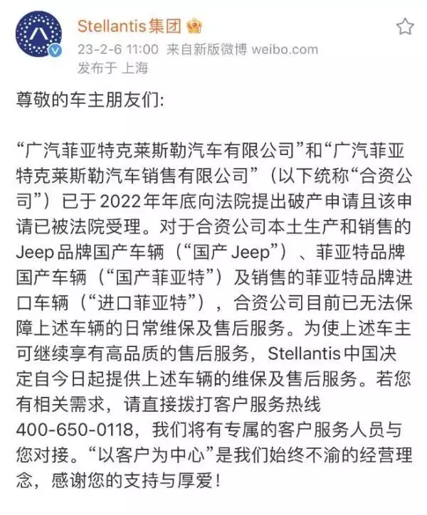 为使上述车友可继续享有高品质的售后服务,stellantis中国决定自今日起提供上述车辆的维保及售后服务若您有有关需求,请直接拨打顾客服务热线400-650-0118,我们将有专属的顾客服务有关人员与您对接。