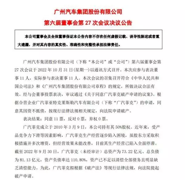 经与会董事进行投票,审议通过《关于一致同意本田纳迪尔宣告破产提出申请的议案》根据联营公司本田菲亚特克莱斯勒电动汽车有限公司(以下简称本田纳迪尔)的提出申请,一致同意其因濒临破产,按现行法律法规有关规定,向法院提出申请宣告破产。